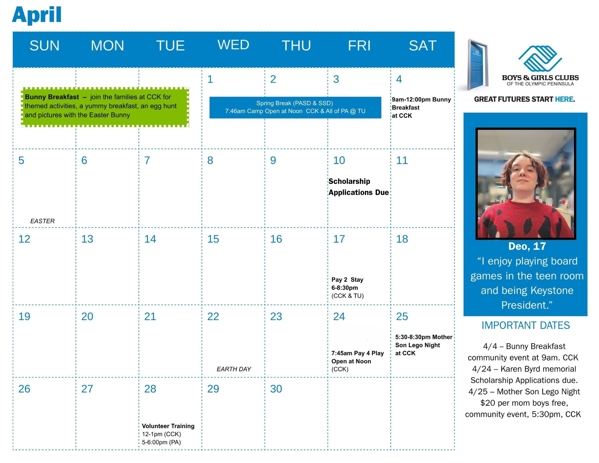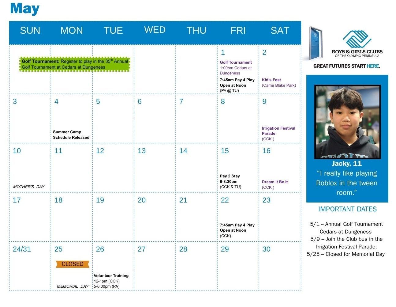 This calendar is here to help families stay connected to what’s happening at the Club. It includes upcoming programs, special events, and important dates. Some activities may require advance registration. While we do our best to keep everything up to date, schedules may change due to weather, staffing, or other unforeseen circumstances. Please check back regularly for updates, and feel free to reach out if you have any questions—we’re always happy to help!